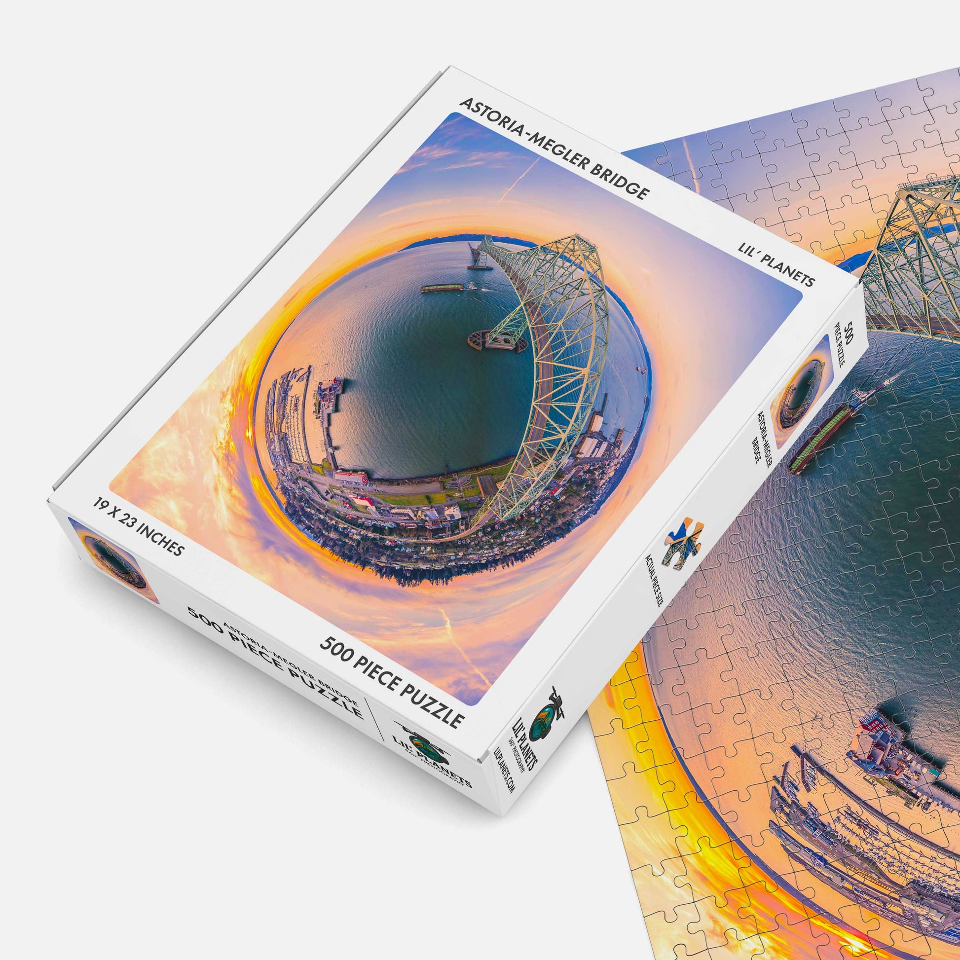 Experience Astoria’s coast from a stunning new angle with this 500-piece puzzle featuring a sweeping 360° aerial view of the Astoria–Megler Bridge. The legendary span stretches across the Columbia River, framed by lush shoreline, shifting tides, and soft coastal light—making every piece part of a dramatic and unmistakably Pacific Northwest scene.