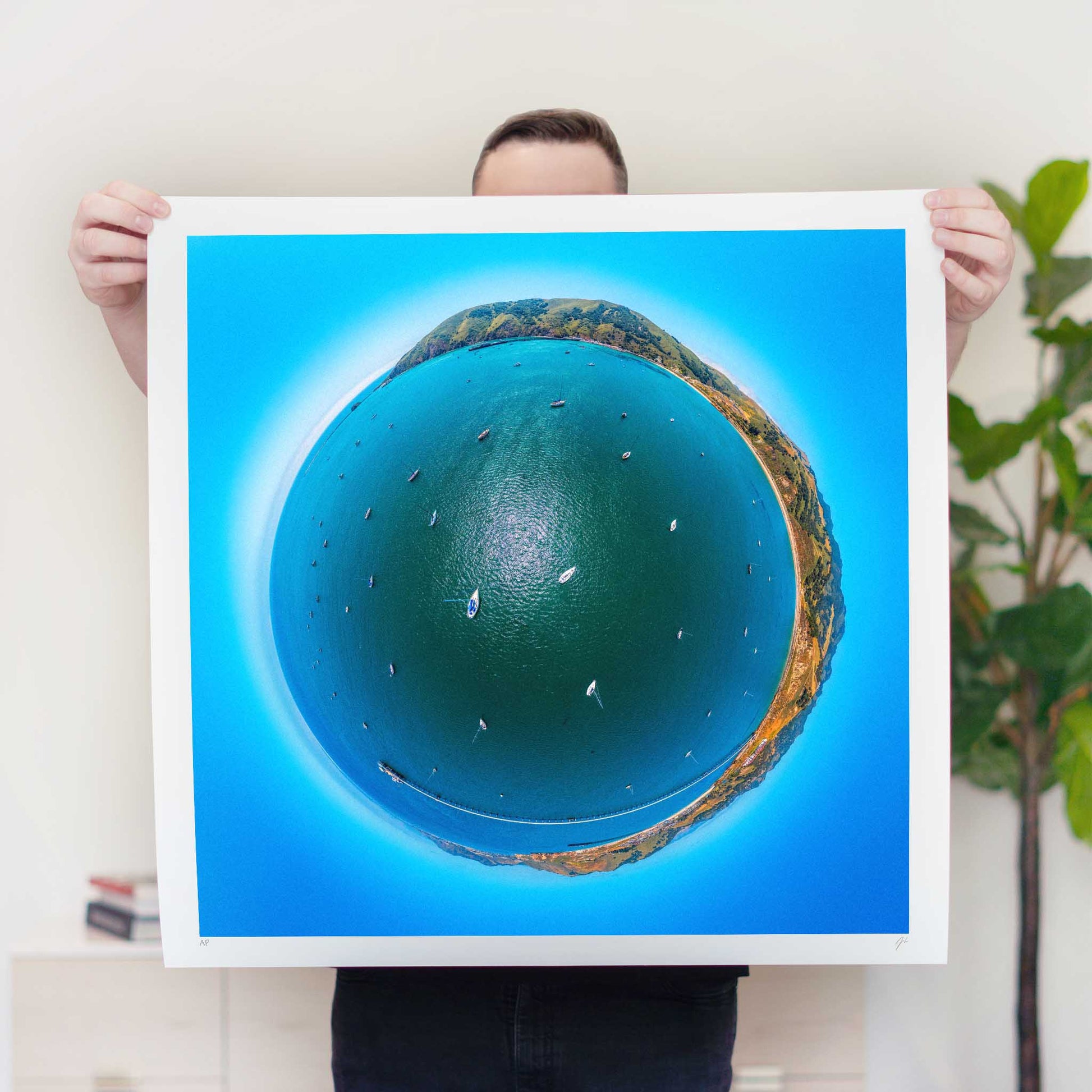 This limited edition 360° print captures the coastal charm of Avila Beach, California, offering an immersive view that places you right above the sparkling Pacific waters sprinkled with sailboats.