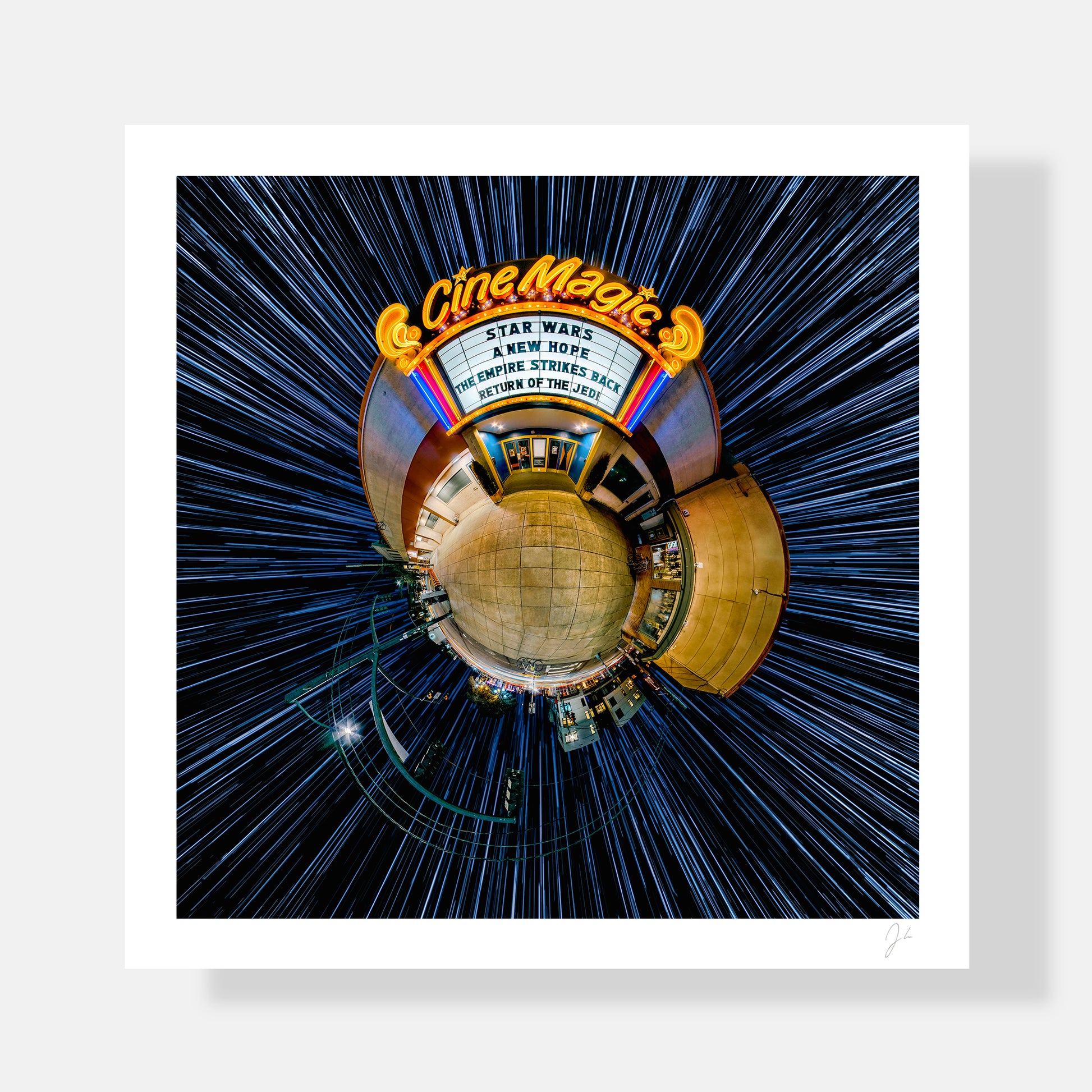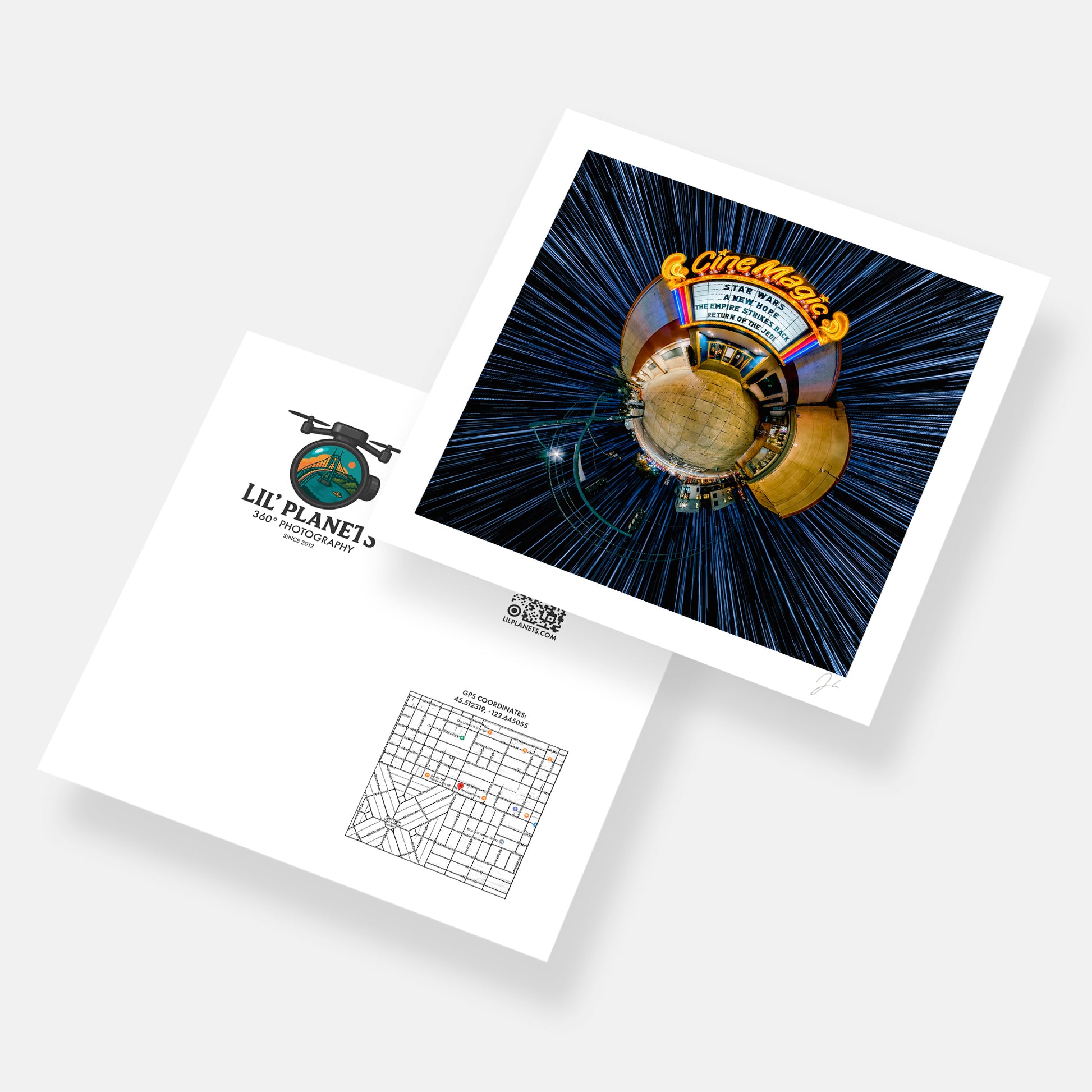 Perfect for brightening your home, office, or as a meaningful gift, this 360° print captures the nostalgic glow of Portland’s CineMagic Theatre, offering an immersive view that blends cinematic charm with a star-streaked night straight out of a galaxy far, far away.