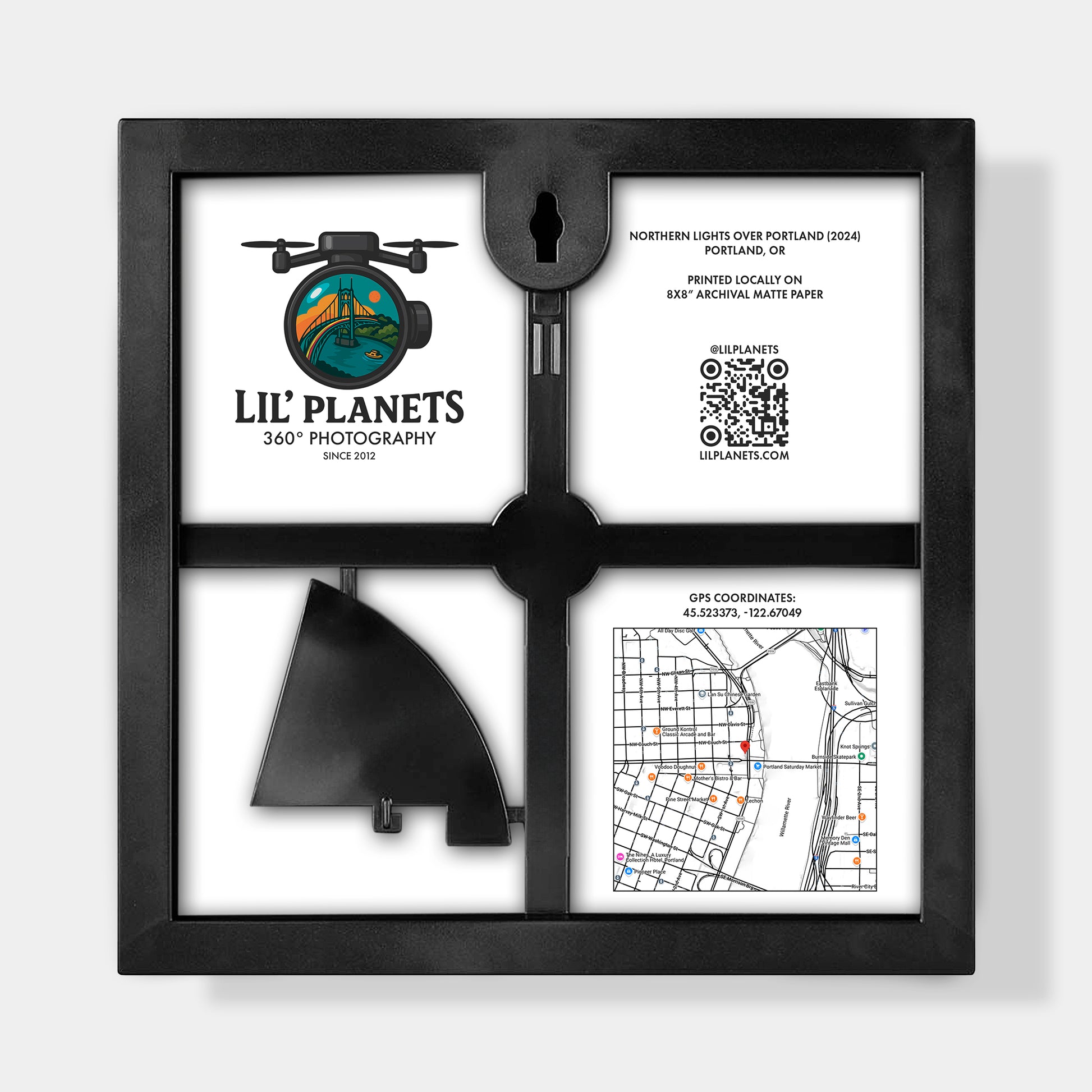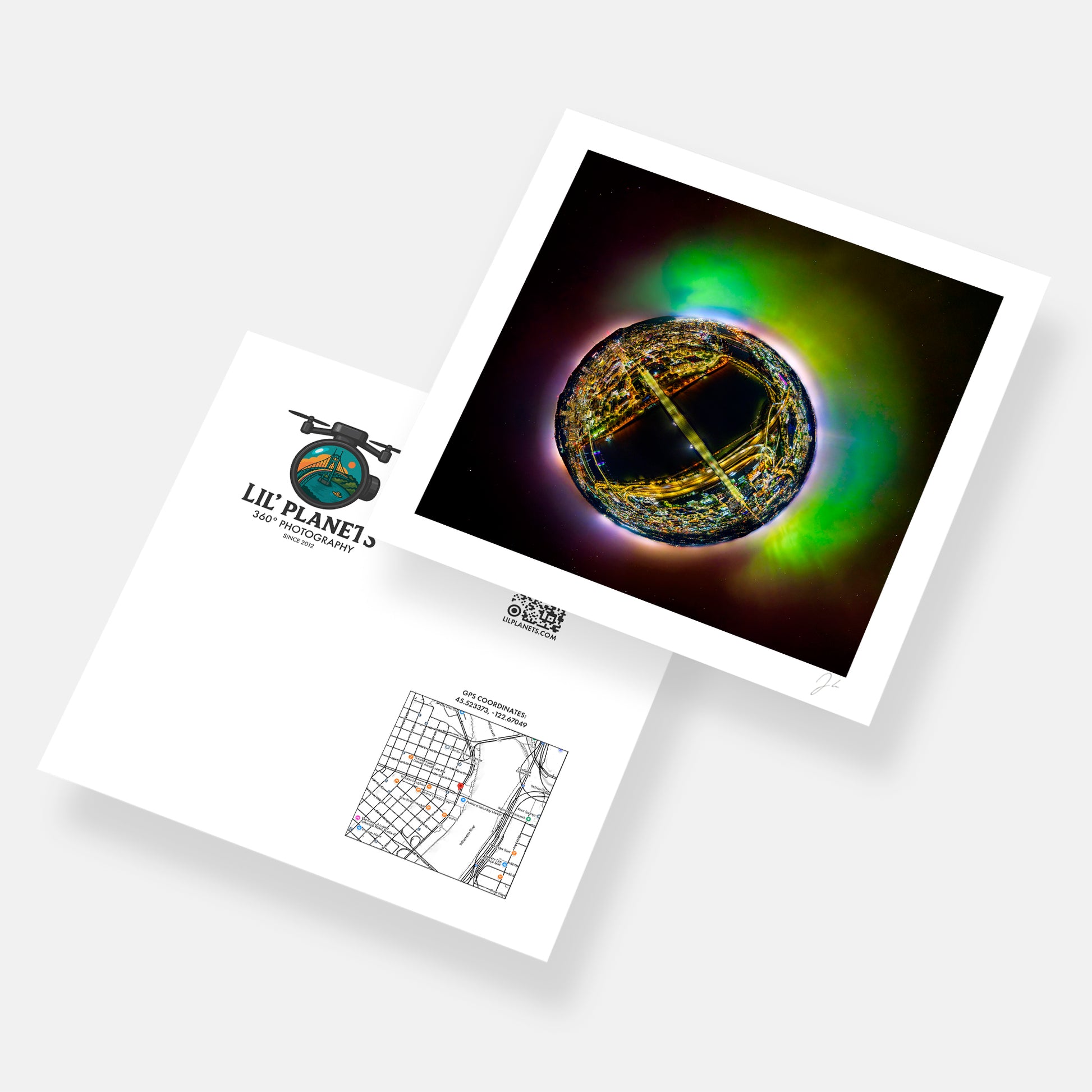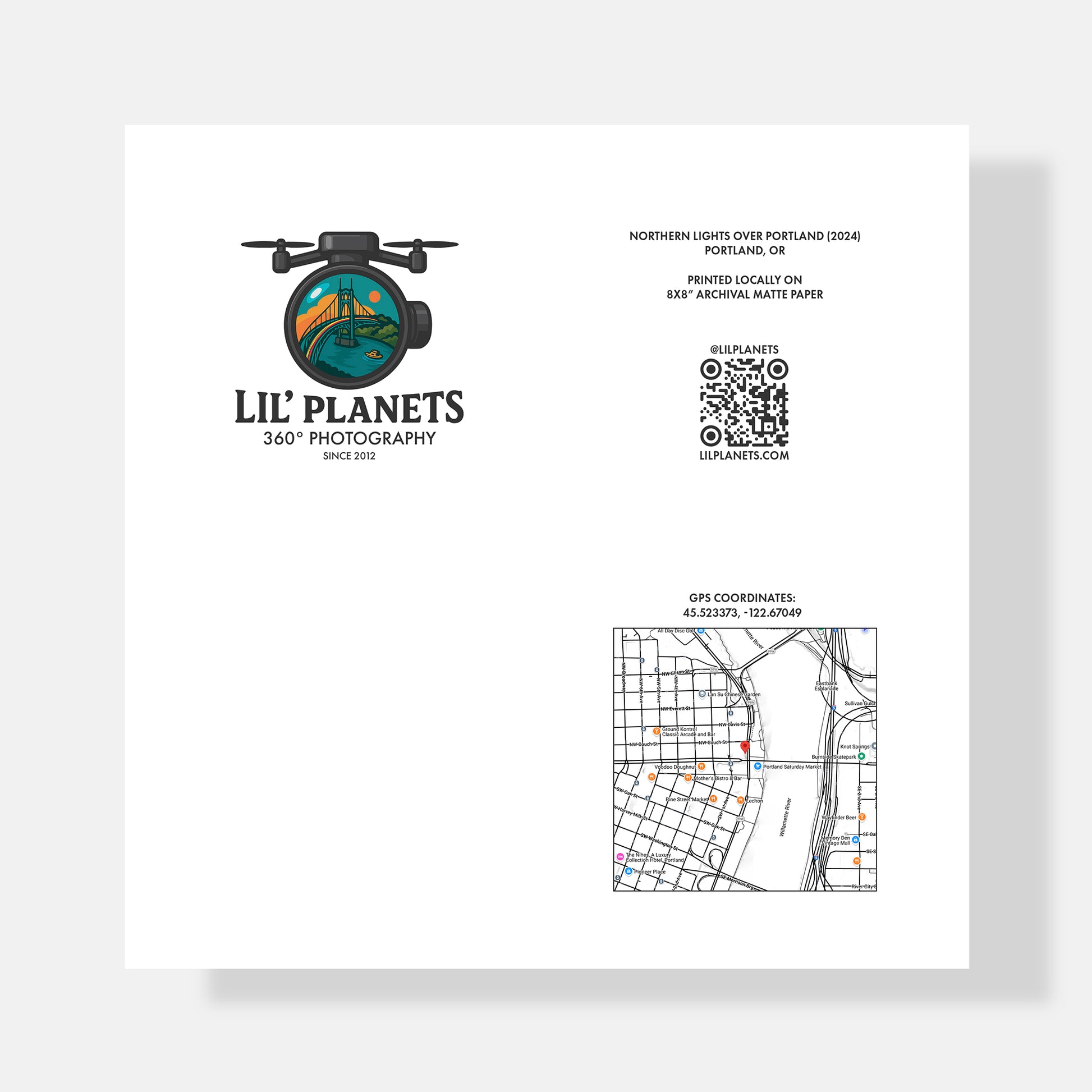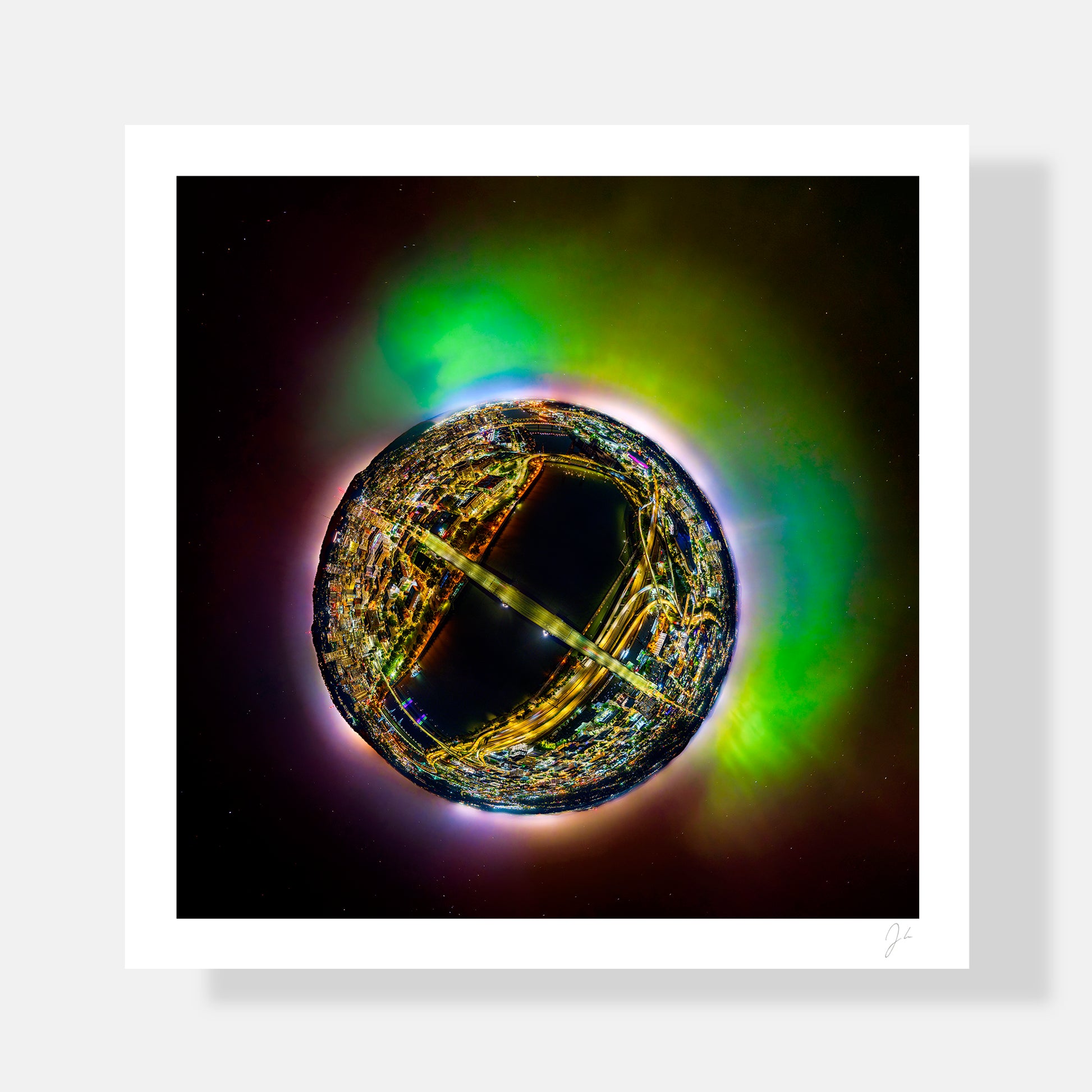 Perfect for brightening your home, office, or as a meaningful gift, this 360° print captures the rare spectacle of the northern lights shimmering above Portland’s skyline, blending celestial beauty with the city’s glowing bridges and streets in a surreal nighttime panorama.