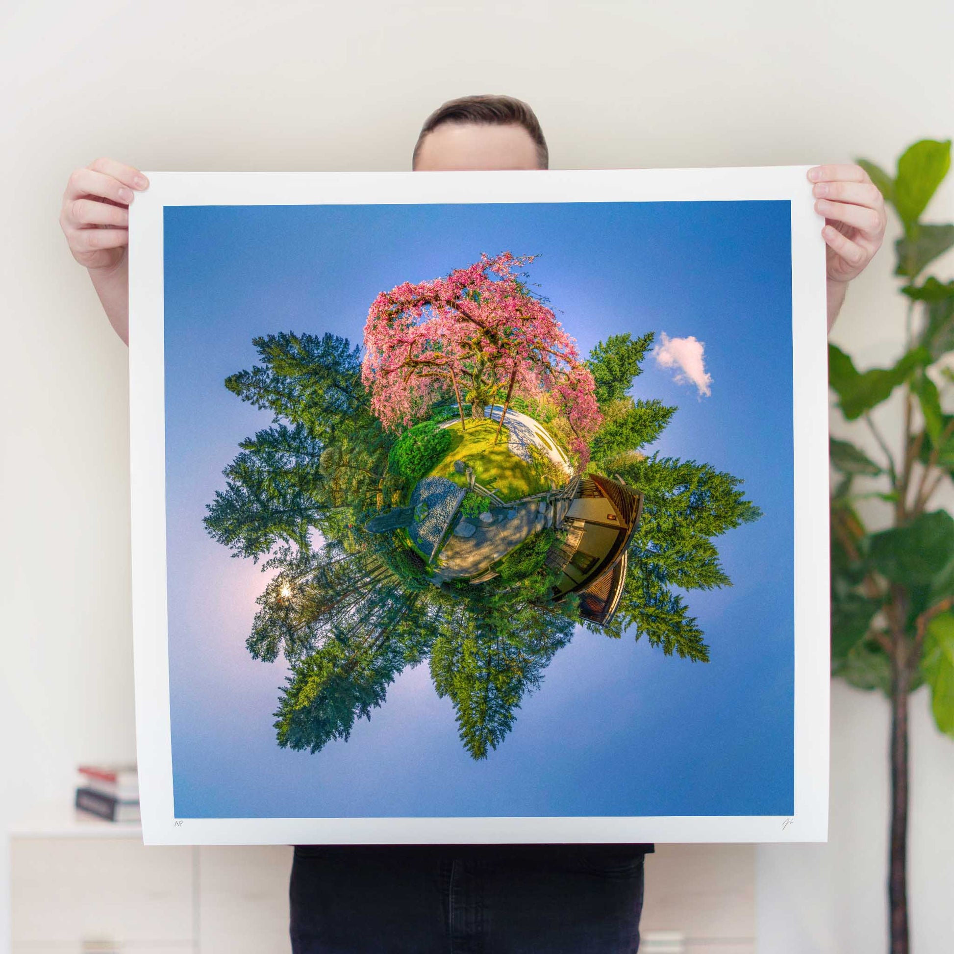 This limited edition 360° print captures a peaceful spring morning at the Portland Japanese Garden, with a cherry tree in full bloom surrounded by towering evergreens.