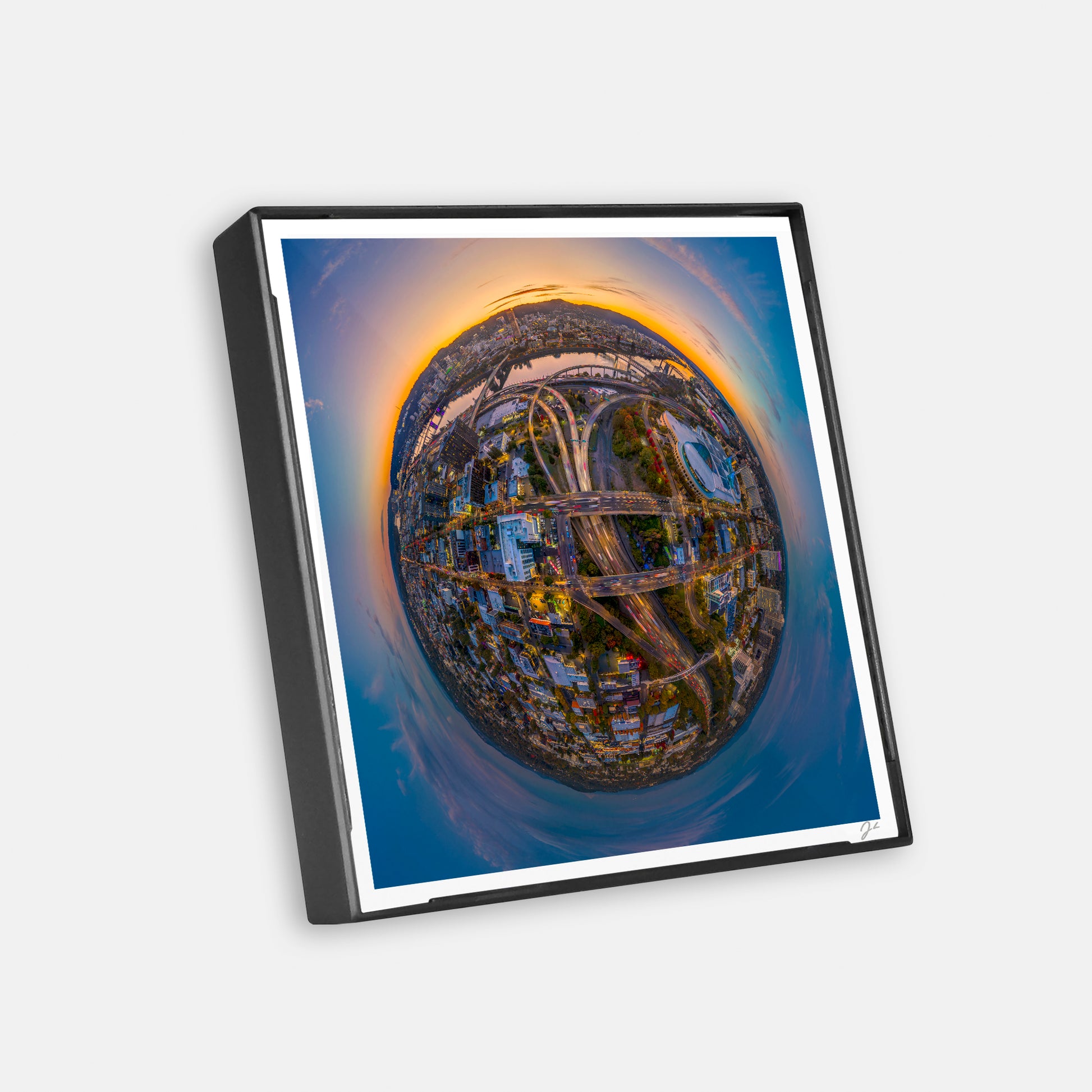 Perfect for brightening your home, office, or as a meaningful gift, this 360° print captures Portland’s downtown skyline at sunset, with glowing bridges and illuminated streets wrapping around the Willamette River in a mesmerizing city-light panorama.