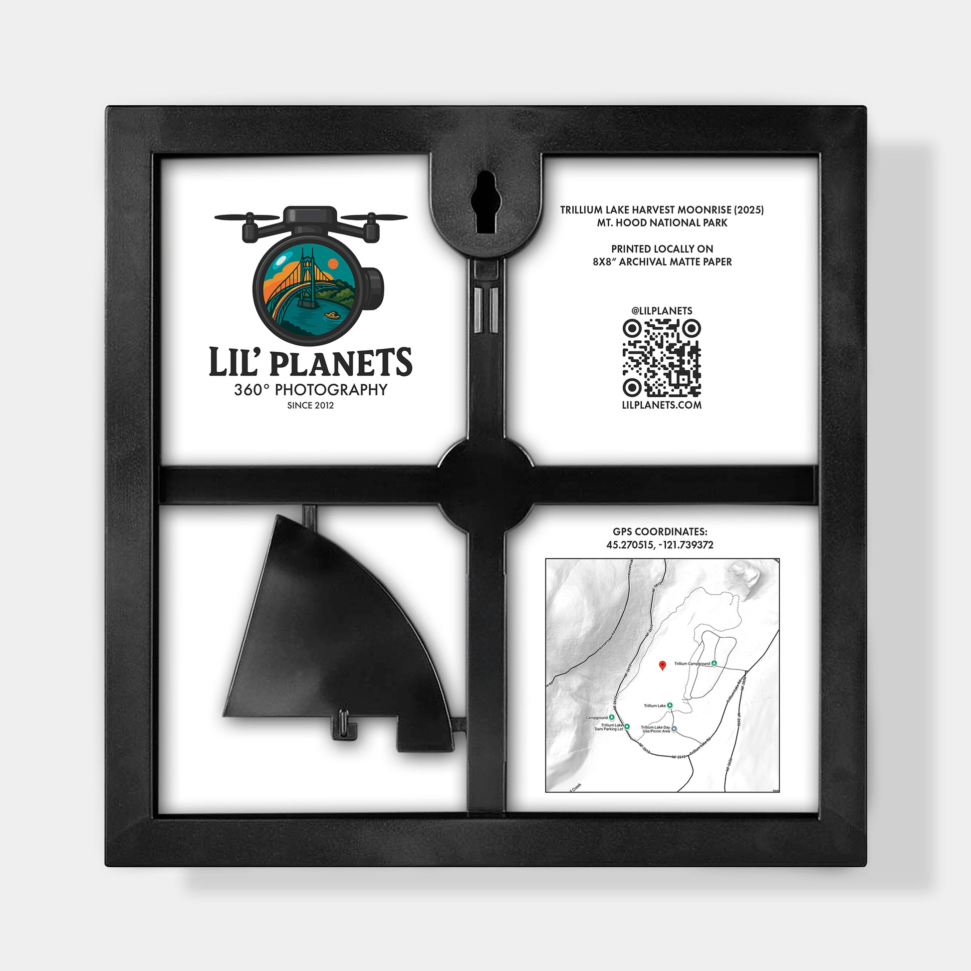 Perfect for brightening your home, office, or as a meaningful gift, this 360° print captures Mount Hood glowing in the warm light of sunset above Trillium Lake, with the moon rising over Oregon’s iconic landscape.